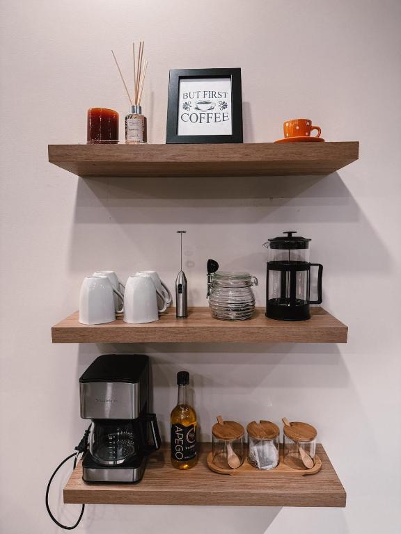 Kitchenette, Refrigerator, Microwave, Washing machine, Kitchen, Electric kettle, Kitchenware, Dryer, Oven, Toaster, Coffee machine, Dining table, Wine glasses